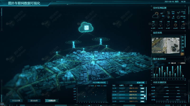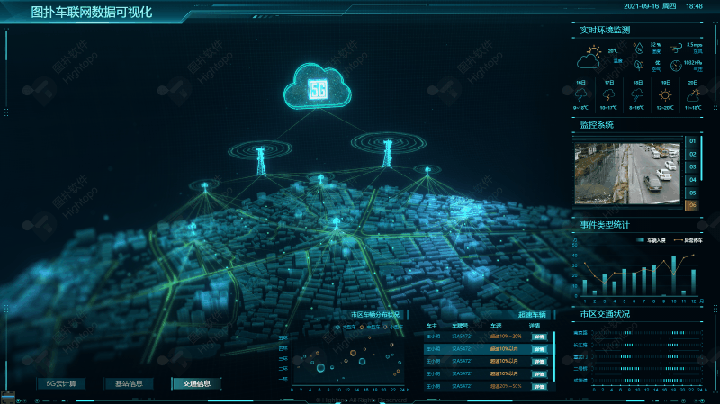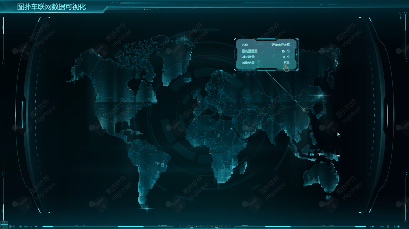 利用可视化实现车联网的整体监控,能提高车联网的运行效率。以全球地图为基,辅以动画。在全球繁多的信息中搜索到图扑车联网数据可视化,用经纬线定位到天津市,点击天津市云计算的 2D 面板下钻至天津市的整体三维场景,并对真实网络空间中的网络架构、系统设备、业务流程的运行状态及运行环境进行模拟和复现。HT 引擎提供的多边型呈现地图区块,轻量快捷,不需要建模就可以完成,极大降低了实施成本和周期。HT 也整合了开源方案实现了 2D、3D 上 WebGIS 的功能,可叠加各类地图底图数据。