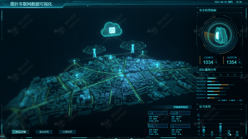 5G移动通信技术能够满足人们对于高速、大容量、高可靠、低时延等快速增长的移动通信业务的需求。而大规模MIMO有源天线技术作为5G移动通信的关键技术之一,它可以通过空间复用大幅度提升频谱利用效率,结合新型编码技术可以大幅度提升通信系统容量和通信速率。基于此,Hightopo的可视化案例在 5G 云计算页面,设置了传输速率监控、安全检查面板、SSL 漏洞分布、证书类型 4 个数据面板,接入实时数据,可进行网络安全的全面管理。