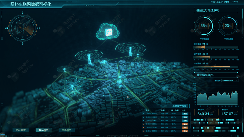 在静态建模基础上,通过叠加多维实时动态数据,进行实时感知和管理。界面左上角不停转动的雷达,扫描基站位置,便于定位管理。
