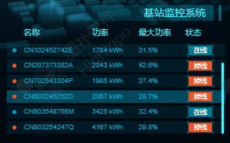 展示了设备名称、功率、最大功率、状态,细化到单个设备的管理。基站监控系统是对基站动力、安防、消防进行远程的、实时的、全方位的无线检测和控制。完善的预警机制,实现多级告警,保障基站的可靠性并有效降低运维成本。