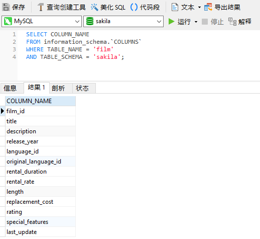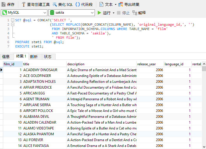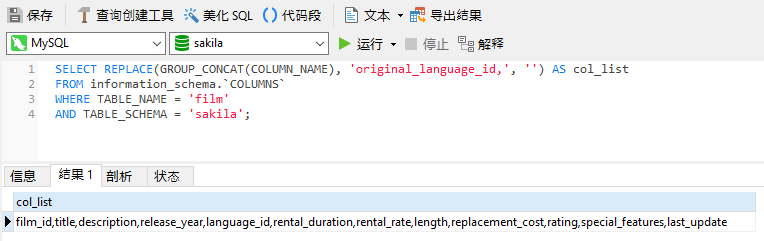 这是我们使用INFORMATION_SCHEMA.COLUMNS表来获取除original_language_id列以外的所有列的方式:
