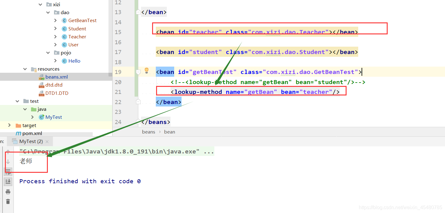 <beans xmlns="http://www.springframework.org/schema/beans"xmlns:xsi="http://www.w3.org/2001/XMLSchema-instance"xsi:schemaLocation="http://www.springframework.org/schema/beanshttp://www.springframework.org/schema/beans/spring-beans.xsd" ><bean id="teacher" class="com.xizi.dao.Teacher">bean><bean id="student" class="com.xizi.dao.Student">bean><bean id="getBeanTest" class="com.xizi.dao.GetBeanTest"><lookup-method name="getBean" bean="student"/>bean>beans>