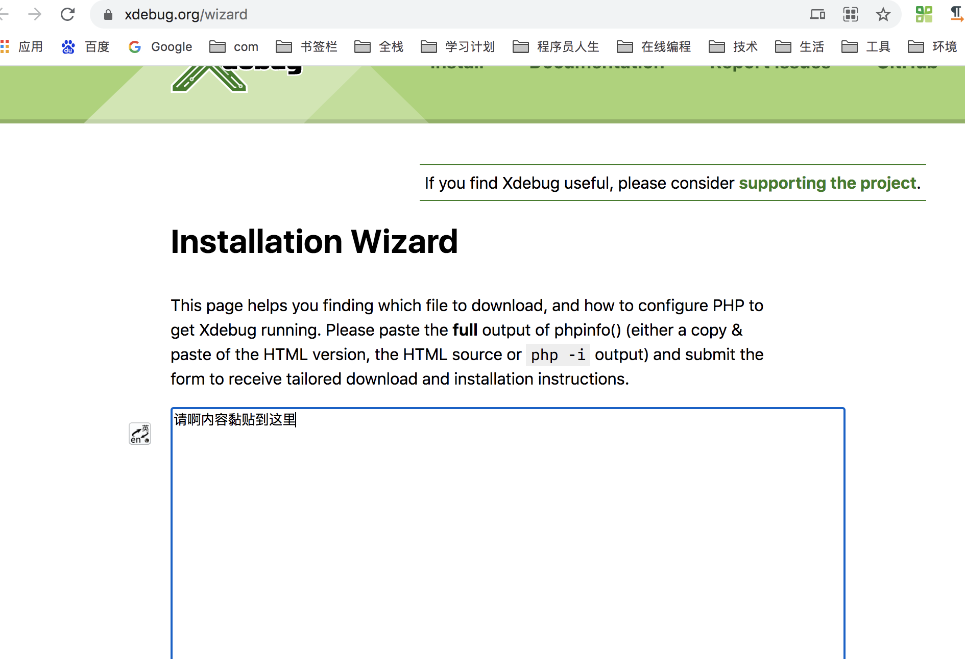 2、如果确定没有安装xdebug,ctrl+a,ctrl+c (全选+复制)本页的所有内容,在浏览器新标签打开链接 https://xdebug.org/wizard 将所有内容黏贴到文本框里面提交,如下图: