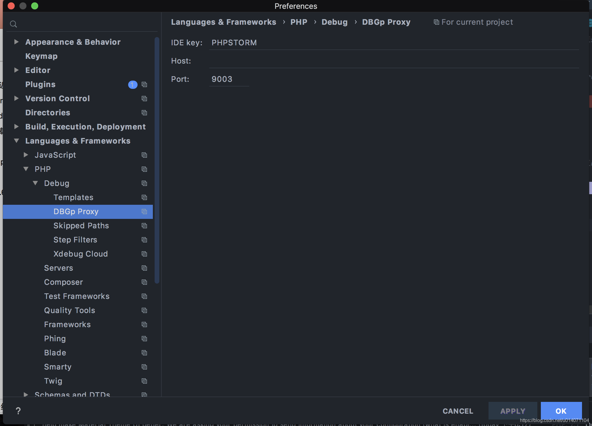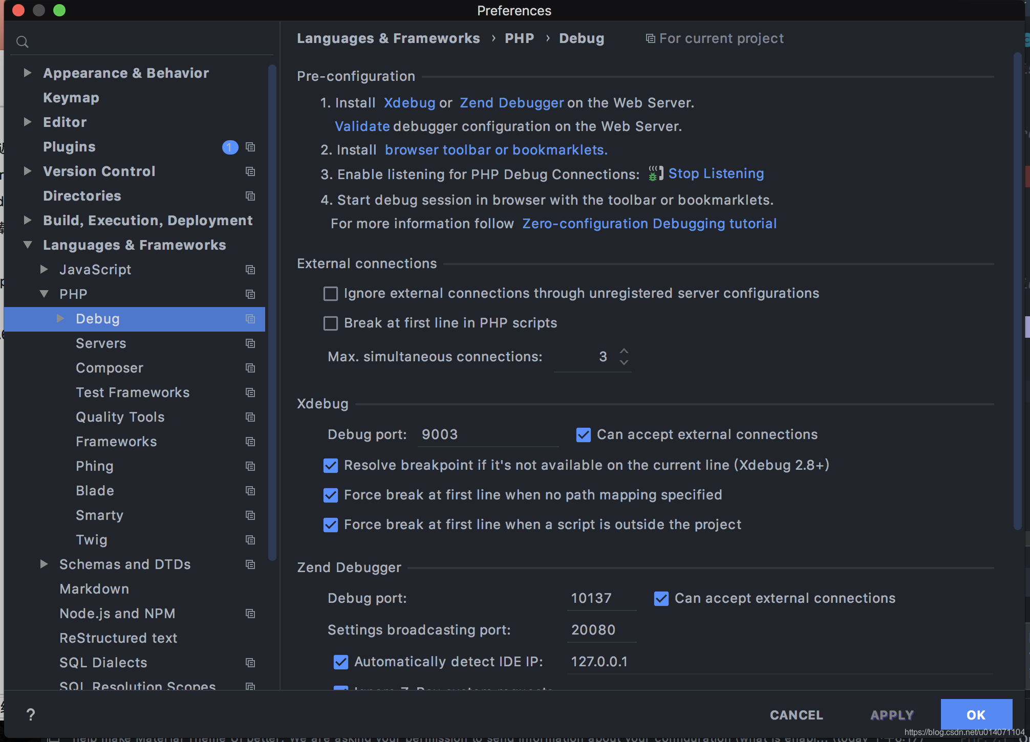 1、右上角菜单 phpstorm->preferences->php->languages&&Frameworks->PHP->Debug