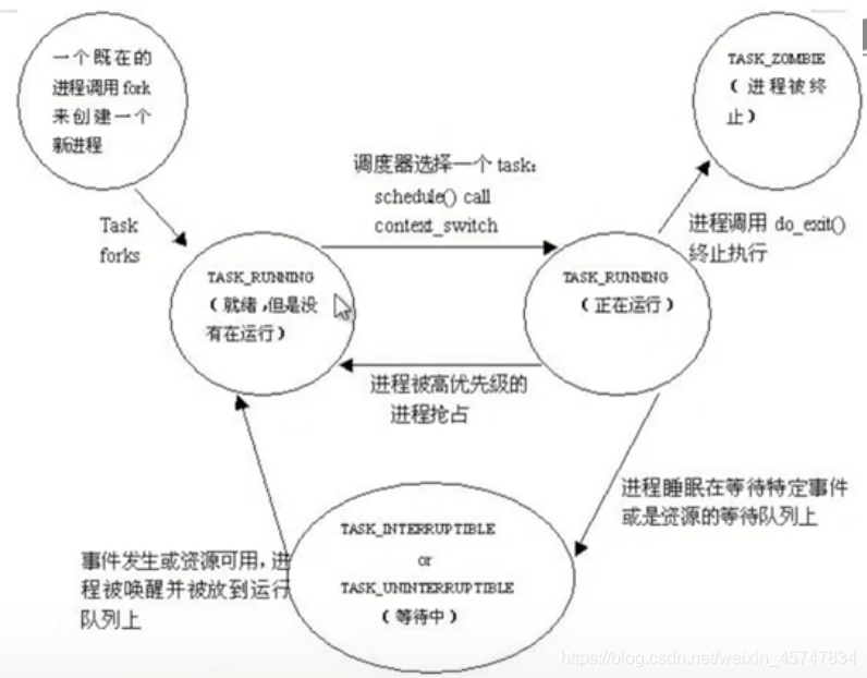 1)获取CPU的调度权,为TASK-RUNNING运行,否则处于TASK-RUNNING就绪