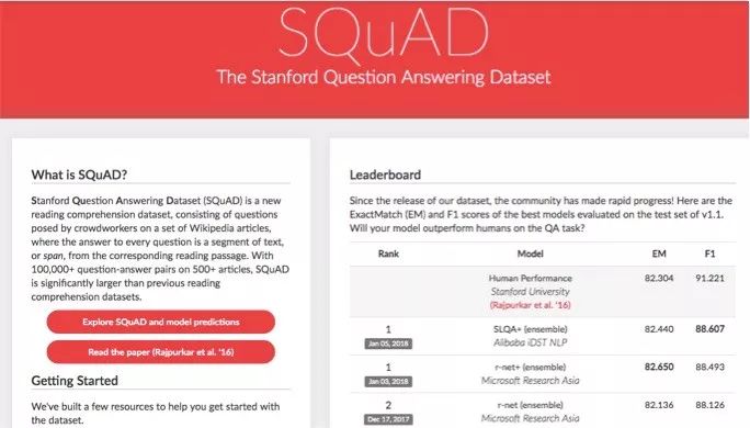 斯坦福大学发起的 SQuAD(Stanford Question Answering Dataset)挑战赛,被认为是目前全球最高水平的 AI 阅读理解赛事。