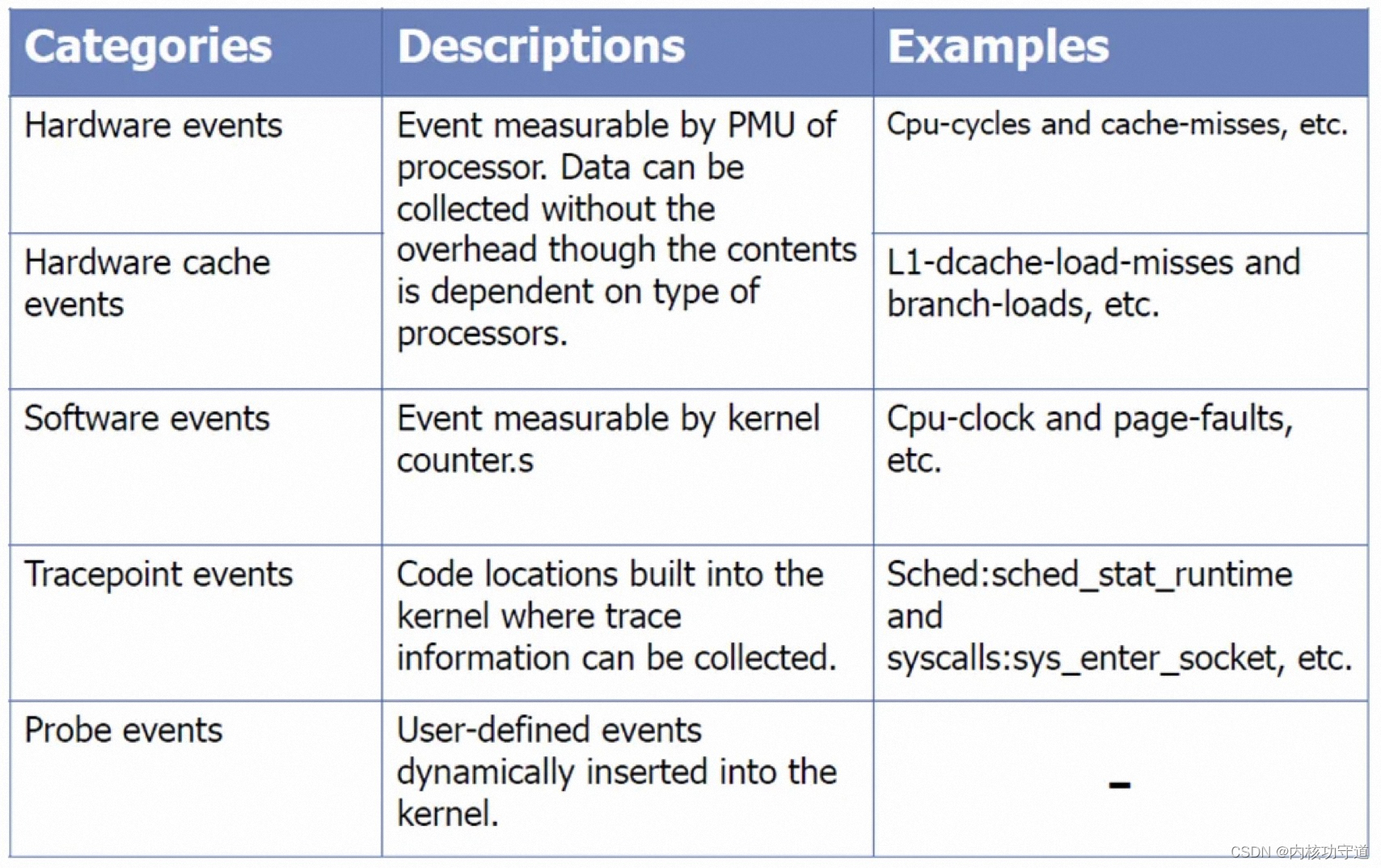Perf Event Subsystem:Perf Event 子系统是内核众多子系统中的一员,其主要功能是和 Perf Tool 共同完成数据采集的工作。另外,Linux Hard Lockup Detector 也是通过 Perf Event 子系统来实现的。