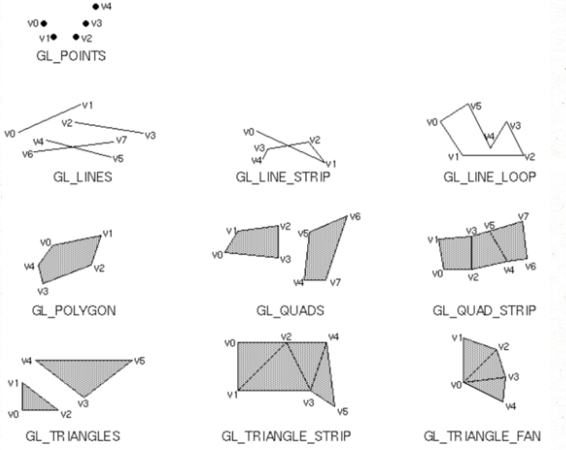 //GL_POINTS(画点)、GL_LINES(每两个顶点为一条直线)、GL_LINE_LOOP(是个环状)、