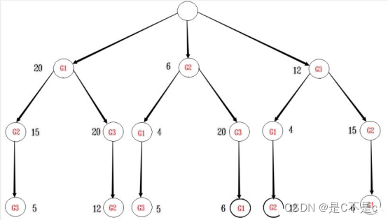 注:本题采用的是男运动员选女运动员的方法,这样就构成了一棵排列树。G表示女运动员,排列树的层数表示男运动员。如第一层的G1=20表示,男运动员1号选女运动员1号的男女双方竞赛优势为20。