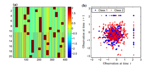 图1 20个实例的时间序列数据集。该时间序列长度为400。热图上的x轴表示时间,y轴表示序列值(a)。图(b)展示的是在时间点t和t+1位置上的值的散点图。需要注意的是在(2,2)点的位置出现重叠。
