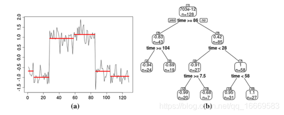 基于树的时间序列学习分类器的传统角色是以递归的方式使用分段常数模型进行近似[Geurts2001A]。一个流行的基于树的表示使用(t, xn(t))作为时间索引t是唯一的预测因子,而xn(t)是目标[Geurts2001A]。图2-3中可以看到CBF数据集[Keogh2011A]的一个时间序列。一开始,所有值的均值都是0。分歧最小化加权平方误差的总和(SSE)的父结点分区的值为两个结点的值是−0.83和0.42。树递归地分区时间序列值,以贪婪的方式最小化整个SSE。由于时间被用作预测器,所以每个终端结点上的值是连续的,并定义一个区间,如图3a所示。在这个例子中,离散向量有128个元素(时间序列的长度)。