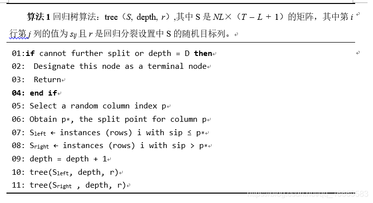 L的设置基本上在方法中设置滞后水平的上界。显然,滞后不能大于T - L。为了模拟所有可能的滞后水平,我们引入了一种新的学习策略,训练J棵树{ gj, j = 1, 2, …, J },在集成框架中。除了在每个结点上选择一个随机预测器段来考虑多个滞后,每个树在该方法中使用随机段长度。这允许对大量可能的滞后水平进行建模。此外,树的深度被限制为D来控制复杂性。算法1显示了构建单个树的步骤。在步骤6中生成分割值的方法可以被修改以用于计算速度。我们考虑两种分裂策略:“回归”和“随机”分裂。