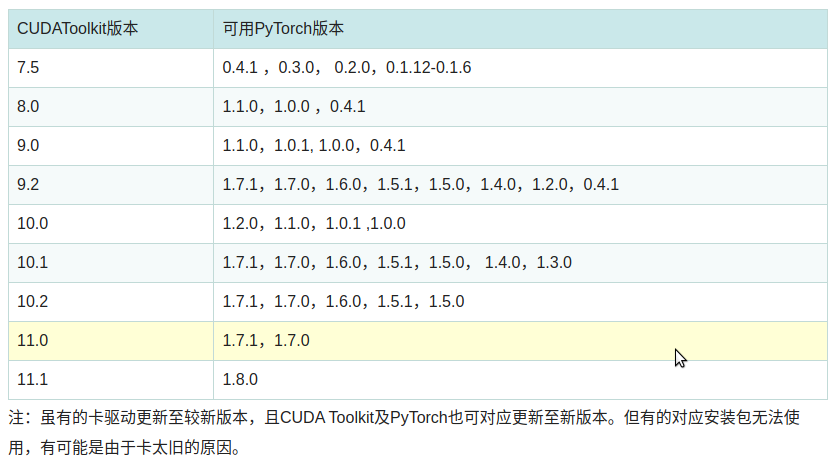 我目前是驱动版本为10.1,我于是将这个设为cudatoolkit=10.1(在我上一篇文章2021(接近2022)linux(ubuntu16.04)安装cuda跑深度学习步骤以及踩坑过程(ELF标头无效、导入torch后torch.cuda.is_available()为False等等)_Dcityy的博客-CSDN博客有提到),但因为我之前的驱动版本是11.4所以不会造成影响,现在版本降低就出现了问题。所以正确的做法是将cudatoolkit设置为小于10.1的。但这里又需要注意一个版本对应问题。