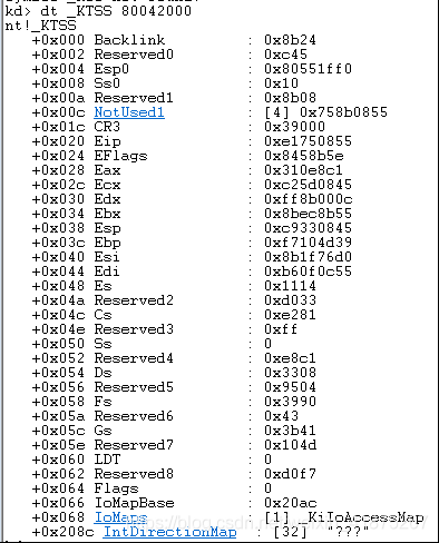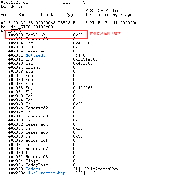 { DWORD dwCr3; // windbg获取char esp[0x1000]; // 任务切换后的栈,数组名就是ESP// 此数组的地址就是TSS描述符中的BaseDWORD *TSS = (DWORD*)VirtualAlloc(NULL,104,MEM_COMMIT,PAGE_READWRITE);if (TSS == NULL){printf("VirtualAlloc 失败,%d\n", GetLastError());getchar();return -1;}printf("请在windbg执行: eq 8003f048 %02x00e9%02x`%04x0068\n", ((DWORD)TSS>>24) & 0x000000FF,((DWORD)TSS>>16) & 0x000000FF, (WORD)TSS);printf("请在windbg中执行!process 0 0,复制TSS.exe进程DirBase的值,并输入.\nCR3: "); // 在windbg中执行 !process 0 0 获取,DirBase: 13600420 这个数要启动程序后现查scanf("%x", &dwCr3); // 注意是%xTSS[0] = 0x00000000; // Previous Task Link CPU填充,表示上一个任务的选择子TSS[1] = 0x00000000; // ESP0TSS[2] = 0x00000000; // SS0TSS[3] = 0x00000000; // ESP1TSS[4] = 0x00000000; // SS1TSS[5] = 0x00000000; // ESP2TSS[6] = 0x00000000; // SS2TSS[7] = dwCr3; // CR3 学到页就知道是啥了TSS[8] = (DWORD)R0Func; // EIPTSS[9] = 0x00000000; // EFLAGSTSS[10] = 0x00000000; // EAXTSS[11] = 0x00000000; // ECXTSS[12] = 0x00000000; // EDXTSS[13] = 0x00000000; // EBXTSS[14] = (DWORD)esp+0x900; // ESP,解释:esp是一个0x1000的字节数组,作为裸函数的栈,这里传进去的应该是高地址,压栈才不会越界TSS[15] = 0x00000000; // EBPTSS[16] = 0x00000000; // ESITSS[17] = 0x00000000; // EDITSS[18] = 0x00000023; // ESTSS[19] = 0x00000008; // CS 0x0000001BTSS[20] = 0x00000010; // SS 0x00000023TSS[21] = 0x00000023; // DSTSS[22] = 0x00000030; // FS 0x0000003BTSS[23] = 0x00000000; // GSTSS[24] = 0x00000000; // LDT Segment SelectorTSS[25] = 0x20ac0000; // I/O Map Base Addresschar buff[6] = {0,0,0,0,0x48,0}; __asm{call fword ptr[buff]}printf("ok: %d\nESP: %x\nCS: %x\n", dwOk, dwESP, dwCS);return 0;