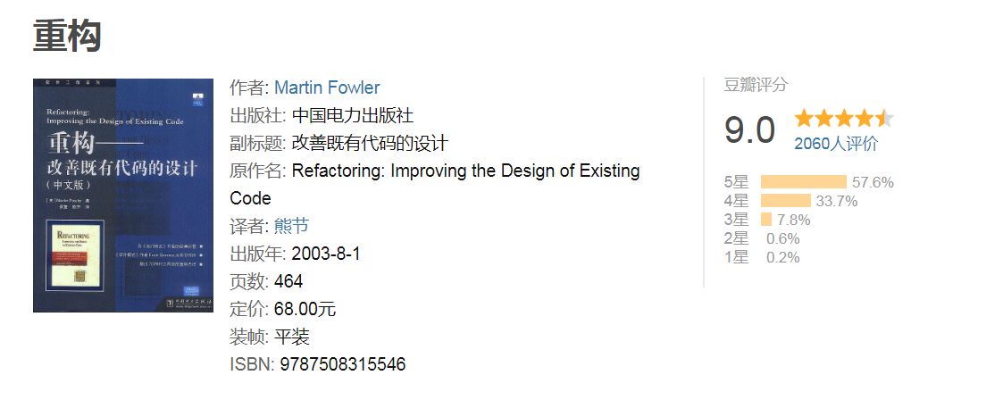 作者清楚揭示了重构过程,他们为面向对象软件开发所做的贡献,难以衡量。这本书解释重构的原理和最佳实践方式,并指出何时何地你应该开始挖掘你的代码以求改善。这本书的核心是一份完整的重构名录,其中每一项都介绍一种经过实证的代码变换手法的动机和技术。