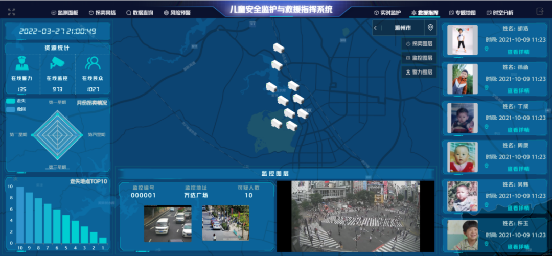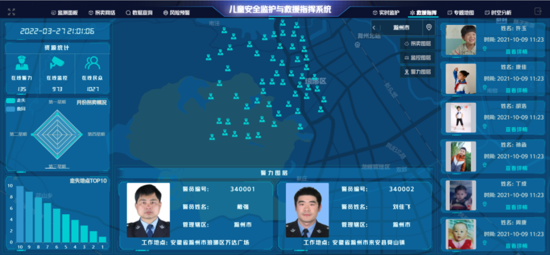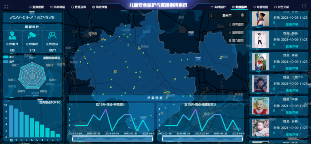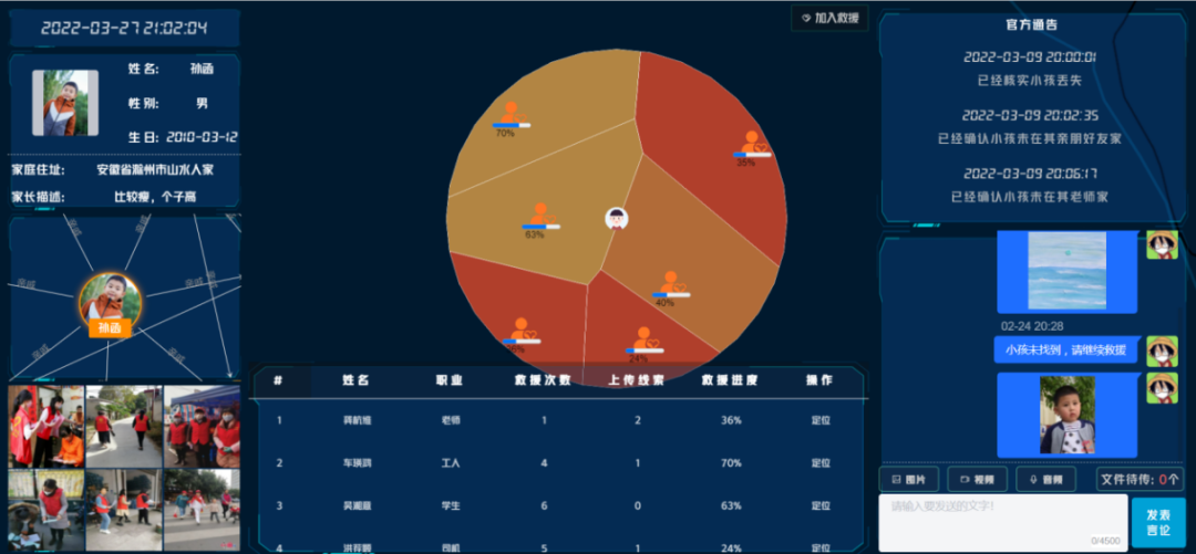 ⑥救援指挥模块统计当前在线的资源以及对本地走失孩童的时间以及地区,同时可展示走失孩童的个人信息以及关系网络照片集视频集与最新的警方通告信息等相关资料为救援提供线索。