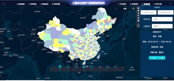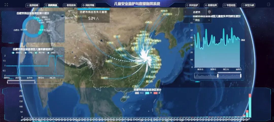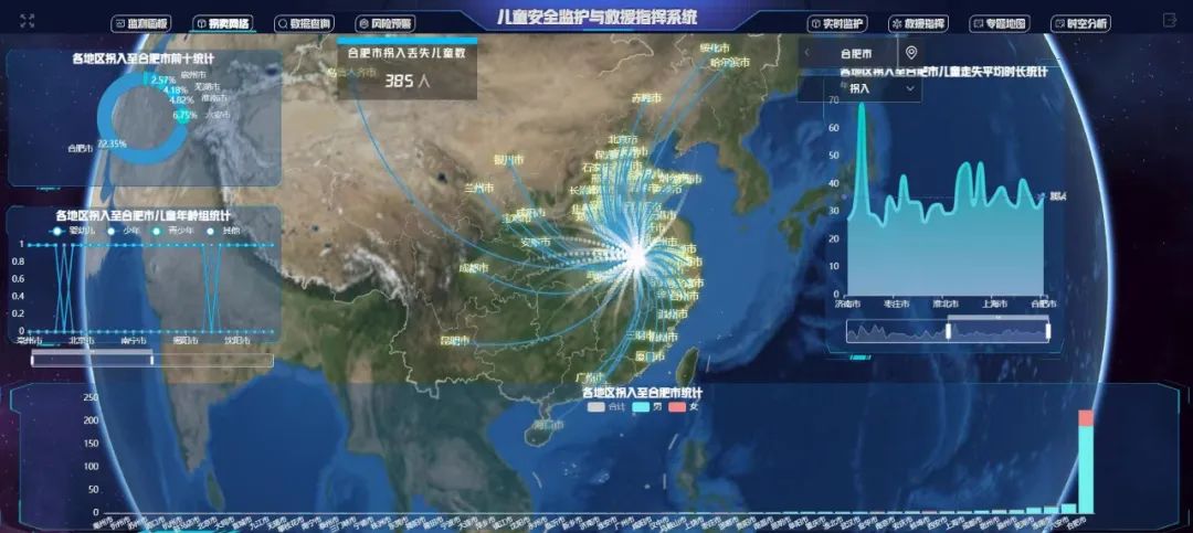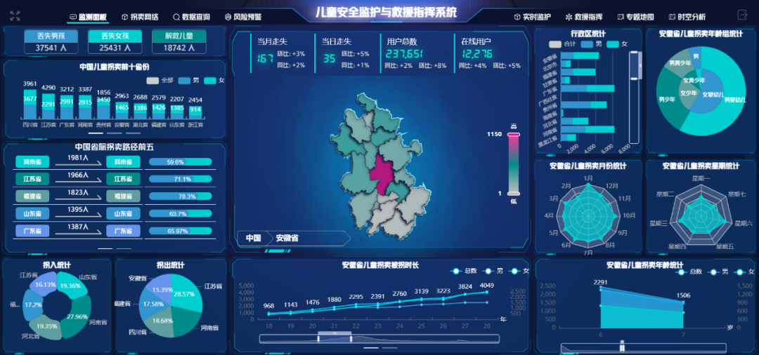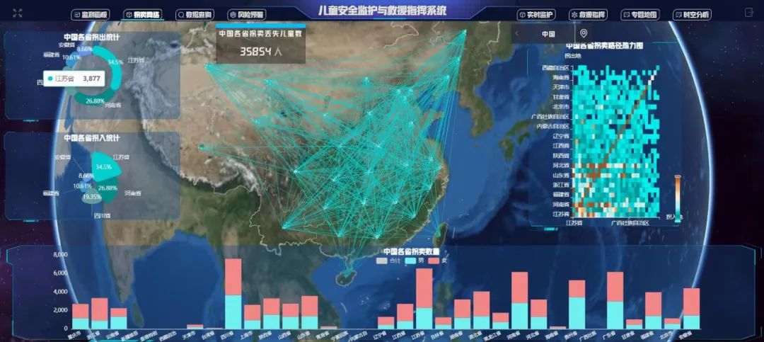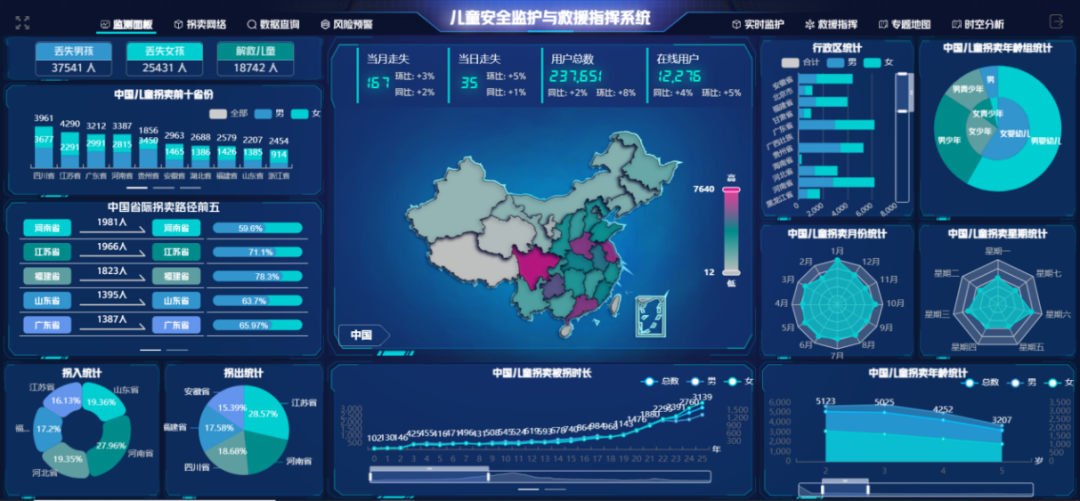 ①监测面板模块利用可视化与GIS技术,从时间、城市、数量、拐卖路径等多尺度多视角结合各类图表动态展示全国、全省、全市三级儿童拐卖数据信息