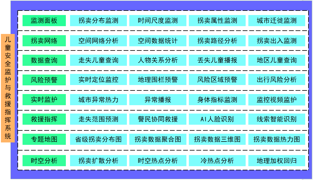 系统总共分8个模块,分别是检测面板模块、数据查询模块、拐卖网络模块、实时监护模块、预测预警模块、救援指挥模块、专题地图模块和时空分析模块。