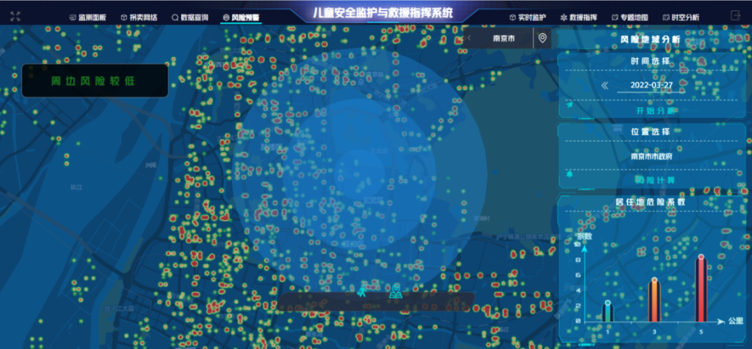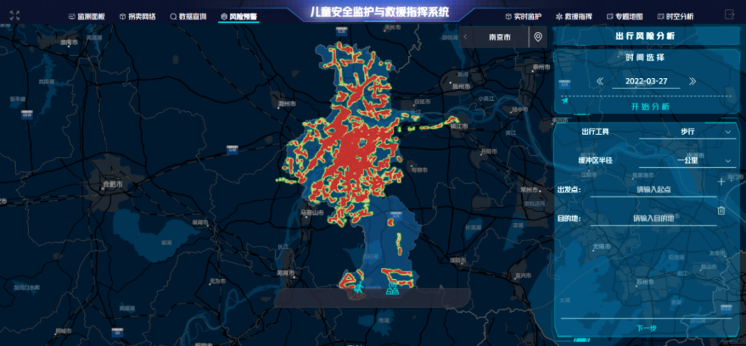 ④风险预警模块根据儿童丢失点位叠加城市路网数据,找到丢失儿童数据栅格建模,用户可根据自定义参数,选择出行交通工具,设置出发点,目的地,及其他参数,系统将规划合适的出行路线,规避高风险路段,并计算得到该路段的出行风险系数。