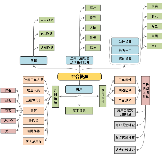 平台数据涉及社会各类资源,如监控数据、社区数据、人员分布数据、物流数据、各类互联网平台数据等,利用移动互联网、大数据、云计算等信息技术实现资源利用与充分调配,建立完善的拐卖打击与预防体系。