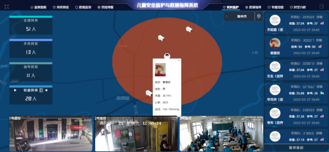 ⑤实时监护模块通过物联网技术,实现了对儿童手势、信号、轨迹等指标的实时监测,并有查看轨迹功能,可以对异常儿童的历史轨迹进行回溯,并查看其实时生理信息。