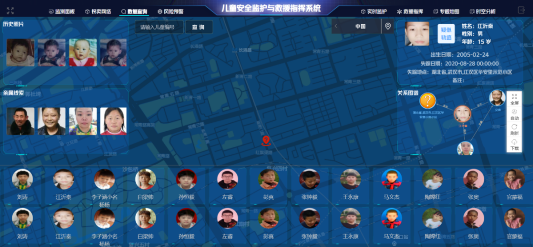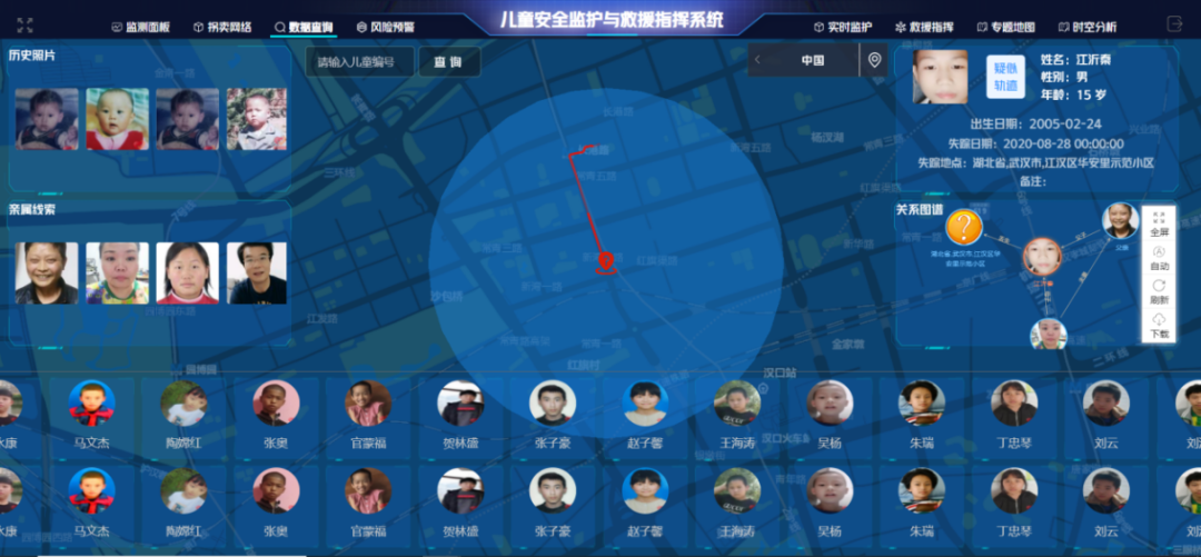 ③数据查询模块可查看该丢失儿童的详细信息、关系图谱,历史照片以及亲属线索