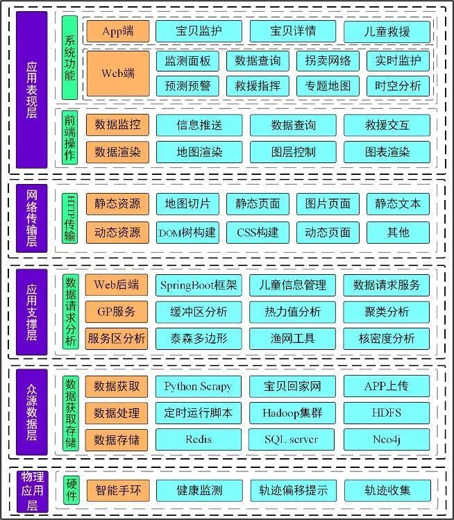 系统采用Hadoop大数据平台,基于分布式爬虫获取的宝贝回家网、失踪人口档案库等丢失儿童以及线索数据,基于ArcGIS API for JS地图前端实现国内实时丢失儿童地图可视化。平台基于全国历年丢失儿童时空大数据,运用云计算、大数据、GIS空间分析技术,研究我国拐卖儿童的时空分异变化机制;采用组件式开发模式,建立了全国范围内拐卖犯罪信息监测与指挥救援网络。系统整体架构采用分层设计模式,平台结构分别为:应用表现层,网络传输层,应用支撑层,众源数据层以及物理应用层,其中应用表现层主要包括系统功能应用及前端操作,功能方面Web端实现了被拐儿童监测面板、数据查询、预测预警、救援指挥、时空分析、专题地图等功能,App端实现了宝贝监测、宝贝详情、儿童救援等功能;操作方面实现了数据监测及数据渲染等;HTTP传输分为静态资源传输以及动态资源传输两大类;数据请求分析包括Web后端,GP服务以及服务区分析;数据方面分为数据的获取、处理以及存储;物理应用层由智能手环支撑,整体架构如图所示:
