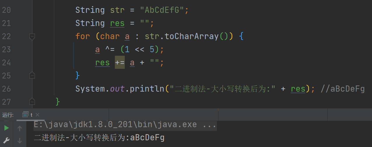 在刷算法或者日常编码的过程中,经常会遇到英文字母的大小写转的问题,一般都是先判断一个字母的ASCII码值是在65-90之间还是在91-122之间,随后在调用toLowerCase()函数和toUpperCase()函数进行转换,我们称其为函数法,就像这样(Java):