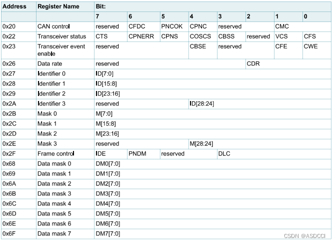 寄存器偏多,主要分为一下几类:主控寄存器、收发控制和局域网寄存器、唤醒控制和状态寄存器、事件捕捉寄存器、标识寄存器。