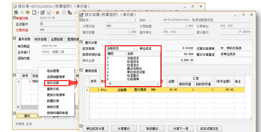 针对客户个性需求,需要对成本进行预测分析,提供试算方案,快速报价。系统提供了多种成本取用方式,可以取用最近采购价、标准进价、价格表、价格清单等展开成本试算后报价,也可直接依据BOM展开成本试算后报价。快速生成销售费用及利润率测算,制造费用测算等不同版本的成本,为报价提供精准的决策依据。