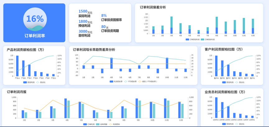 实时成本试算,接单可及时计算订单利润金额;系统可以自动计算订单各产品当前毛利、标准毛利,订单产品实际成本、实际利润。订单利润可视化,从销量,成本,利润,效率四个方面全面提升。
