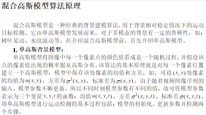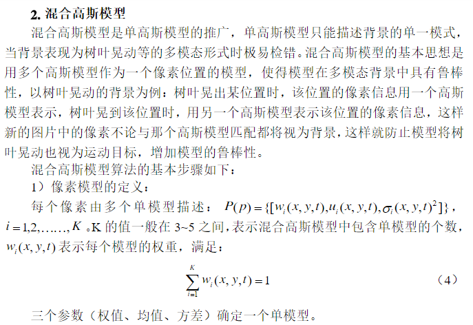 (2)实际场景中,光照条件往往不稳定,且存在一些局部运动的背景物体(譬如摇摆的树枝),此时使用多个高斯分布表达比较合适