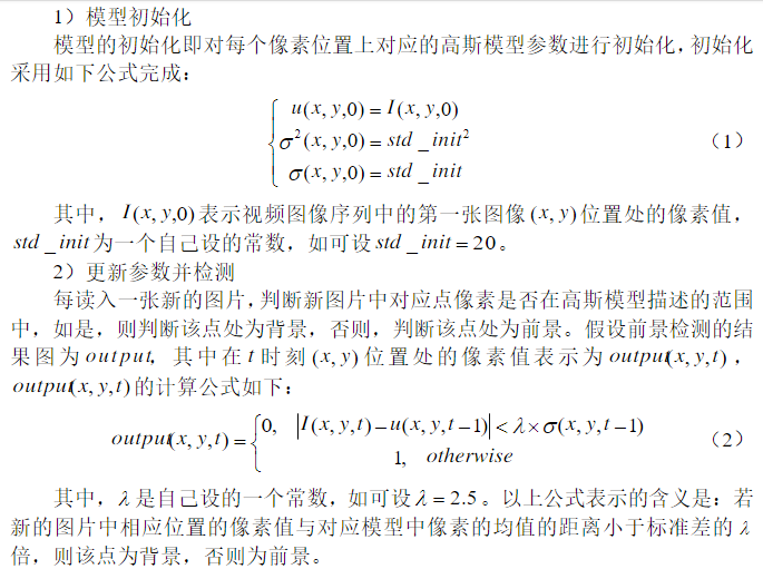 归纳一下其中的流程,首先初始化预先定义的几个高斯模型,对高斯模型中的参数进行初始化,并求出之后将要用到的参数。其次,对于每一帧中的每一个像素进行处理,看其是否匹配某个模型,若匹配,则将其归入该模型中,并根据新的像素值对该模型参数进行更新,若不匹配,则以该像素建立一个高斯模型,初始化参数。最后选择前面几个最有可能的模型作为背景模型,为背景目标提取做铺垫。