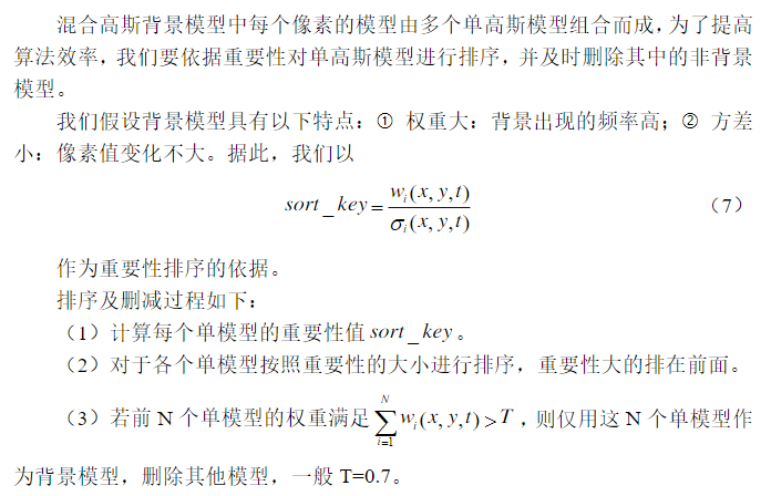 上图中的“排序及删减”有些不确切,实际过程中不会“删减”N之后索引的高斯分布,而是作为前景点判断的一种条件。计算过程中前景点的判断标准包括与当前高斯模型集合都不匹配的点,和虽然匹配上了但是匹配的模型索引超出了由T计算得到的N;后者一般是场景中新出现没有多久的像素点。