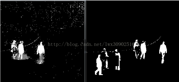 背景提取效果如下图所示,左边为BackgroundSubtractorMOG2算法效果,右边为BackgroundSubtractorMOG效果。忽略左边图像中的一些噪点,两者的最大不同在于左边图像中存在灰色填充的一些区域,这正是BackgroundSubtractorMOG2算法的一个改进点-阴影检测,那些灰色区域就是算法计算得到的“阴影”区域。另外一处不同在于算法的运行时间,根据控制台输出结果,BackgroundSubtractorMOG2每帧检测大概0.03s,BackgroundSubtractorMOG每帧检测大概0.06s,BackgroundSubtractorMOG2算法在运行时间上有较大提升(不全是算法本身原因,实际上BackgroundSubtractorMOG2在执行时通过多线程并行执行)。