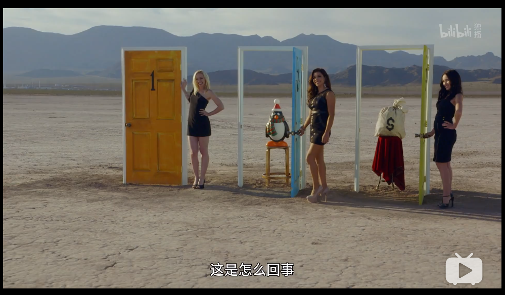 先说明一下猜奖流程:你的面前有三道门,其中一道门后面有一个奖励(钱),其他门后面没有奖励(企鹅),现在猜哪道门后面有奖励。很容易知道此时每道门都有三分之一的可能性有奖。