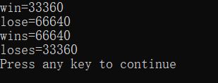 {int circle;for(circle=0;circle<100000;circle++){int award=0,choice=0;award=rand()%3+1;choice=rand()%3+1;//printf("%d,%d\n",award,choice);int observe=0;if(choice==award){do{observe=rand()%3+1;}while(observe==award);}else{for(observe=1;observe==choice||observe==award;observe++){;}}//printf("%d\n",observe);if(choice==award){win++;}else{lose++;}int choice2=1;for(;choice2==choice||choice2==observe;choice2++){}if(choice2==award){wins++;}else{loses++;}}printf("win=%d\n",win);printf("lose=%d\n",lose);printf("wins=%d\n",wins);printf("loses=%d\n",loses);return 0;