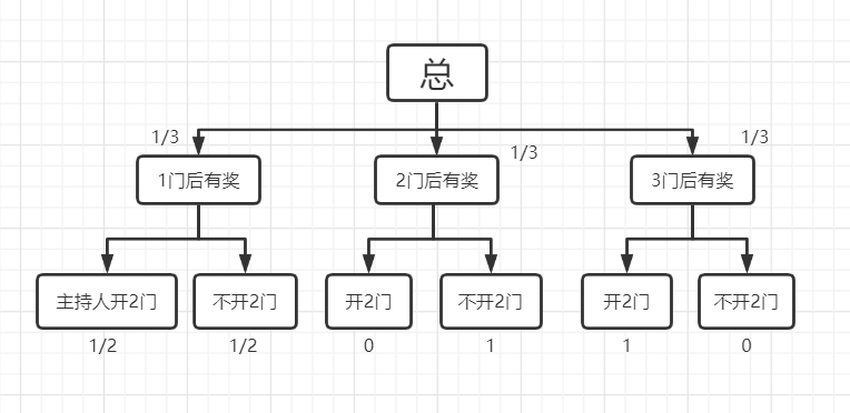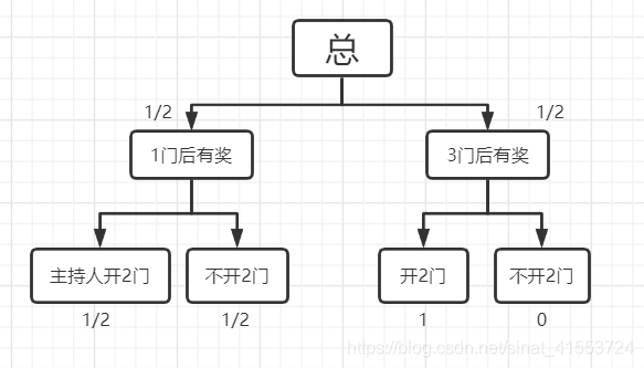 那么,如果你第一次选1门,而真实情况是1门后面有奖,那主持人开第二道门的概率就是1/2。如果真实情况是第二道门有奖,那么主持人开第二道门的概率是0。而如果真实情况是第三道门有奖,那么主持人开第二道门的概率是1。由此可见,因为主持人行为受系统真实状态干扰,所以他的行为一定会影响第二次你选择门的概率。而且显而易见,这儿第三道门的概率一定是增大了的,但是到底增大了多少呢?
