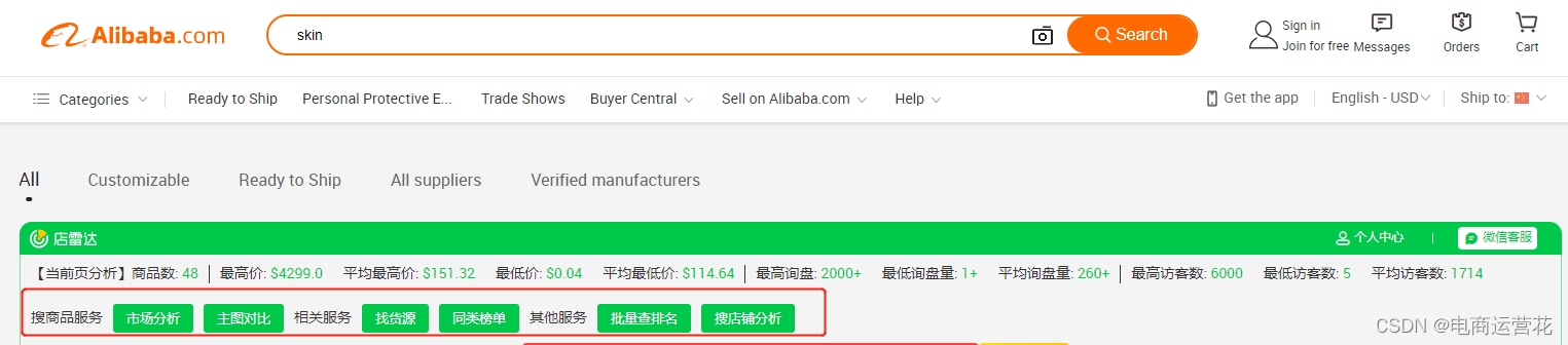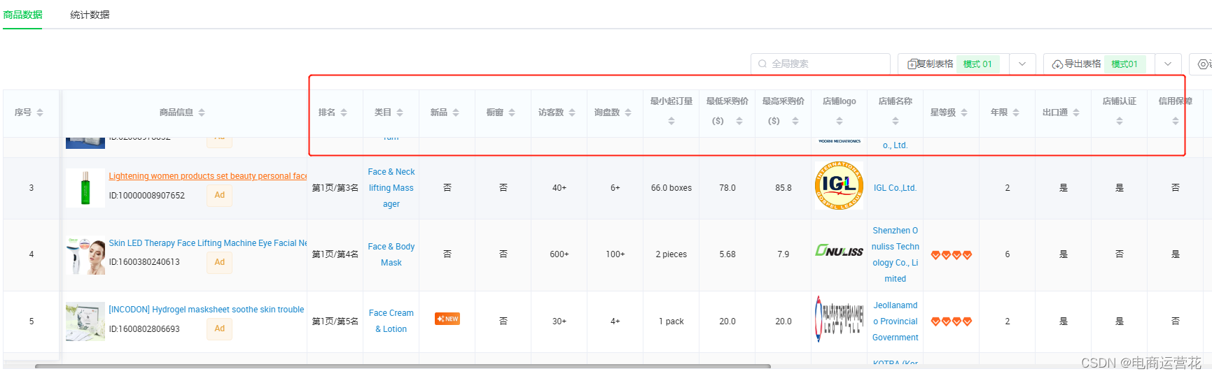 和阿里巴巴国内站一样,选定具体商品后,针对当前页分析可以拿到数据:商品数、最高价、平均最高价、最低价、平均最低价、最高询盘、最低询盘量、平均询盘量、最高访客数、最低访客数、平均访客数。