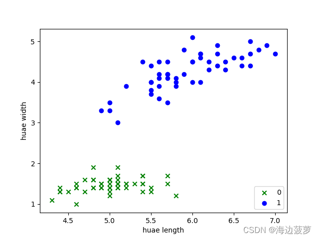 #print(target) #可以看到iris数据集的目标属性,很多012x=data[0:100,[0,2]] #这个实验只取前两列花萼长度,100行,花萼宽度作为实验数据