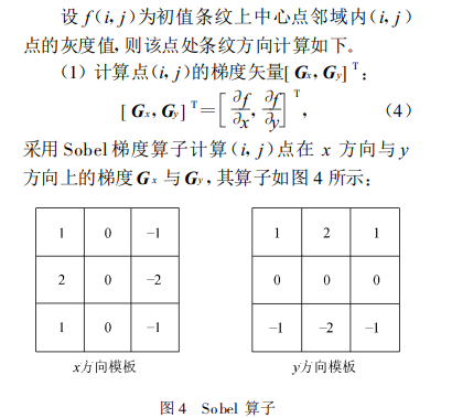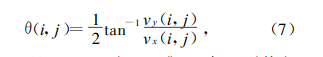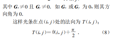 计算出梯度后,采用 Bazen 方法计算光条在点(i , j) 处的法向 : 取以(i , j)为中心的 w ×w 子块, 计算点(i , j)的方向 θ(i , j):