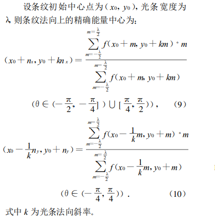 首先基于灰度阈值法 ,利用条纹在行与列上的 分布情况提取条纹全分辨率中心点 ,并作为初值, 然后在初值点计算条纹法向, 最后 ,在条纹法向上 精确获取条纹的能量中心 。