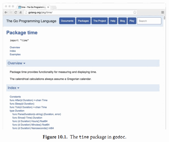 第二个工具,名字也叫godoc,它提供可以相互交叉引用的HTML页面,但是包含和go doc命令相同以及更多的信息。图10.1演示了time包的文档,11.6节将看到godoc演示可以交互的示例程序。godoc的在线服务https://godoc.org ,包含了成千上万的开源包的检索工具。