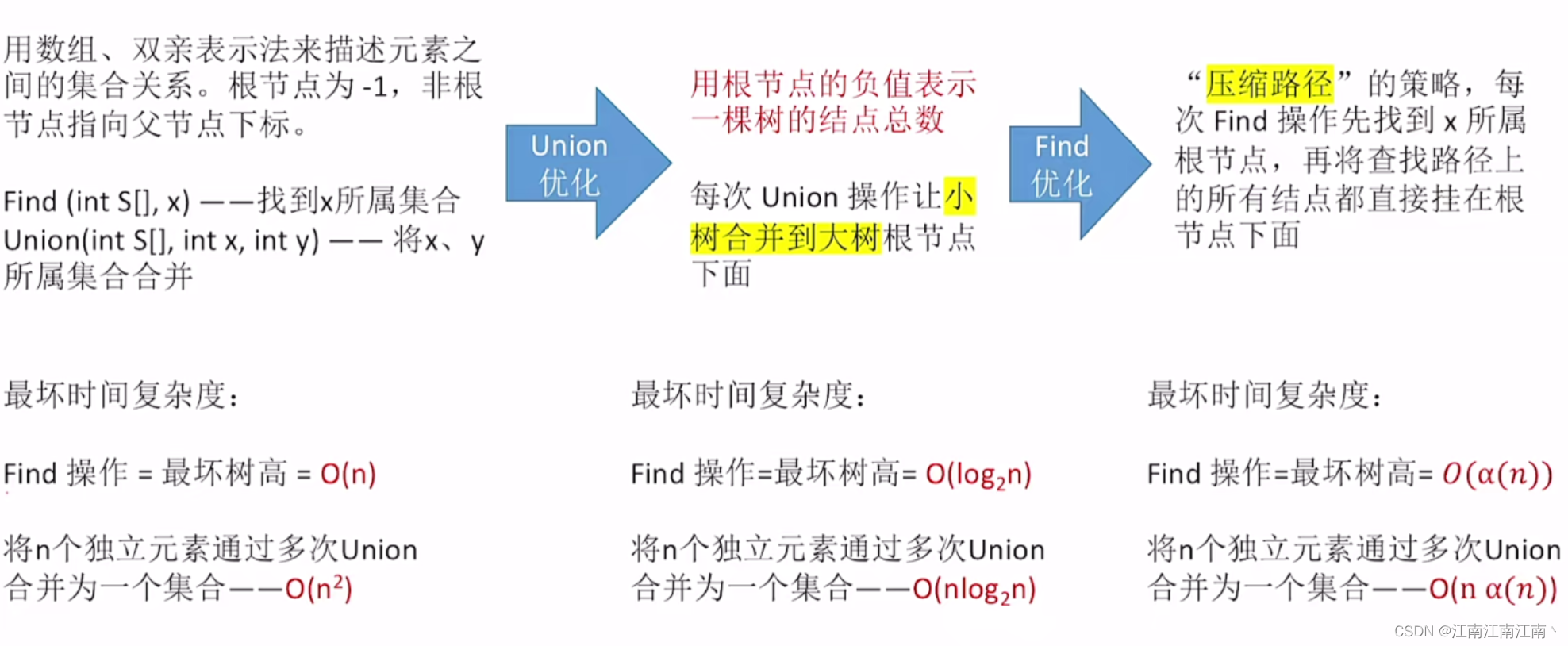 1.如果每次都是大树合并到小树,则树的高度每次都会 + 1,导致并查集的使用效率降低→find最坏时间复杂度O(n)