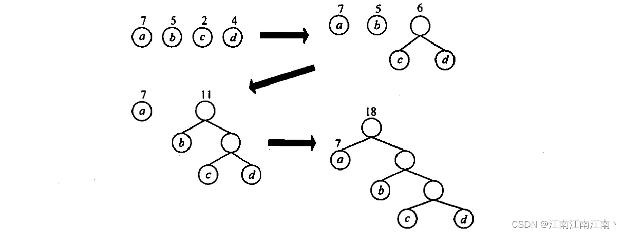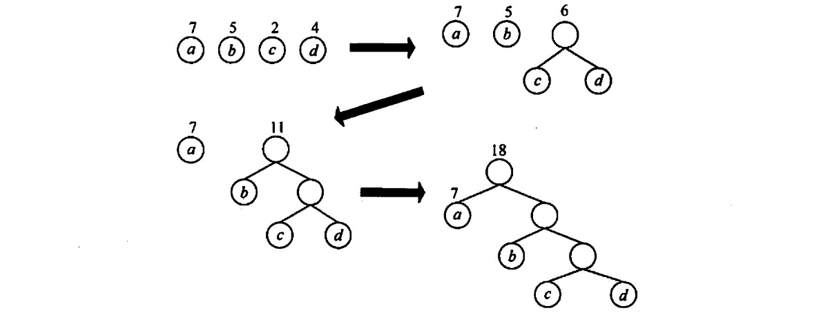 - 找到当前权值最低的两个结点,形成一个新的树,其根节点权值为两点之和