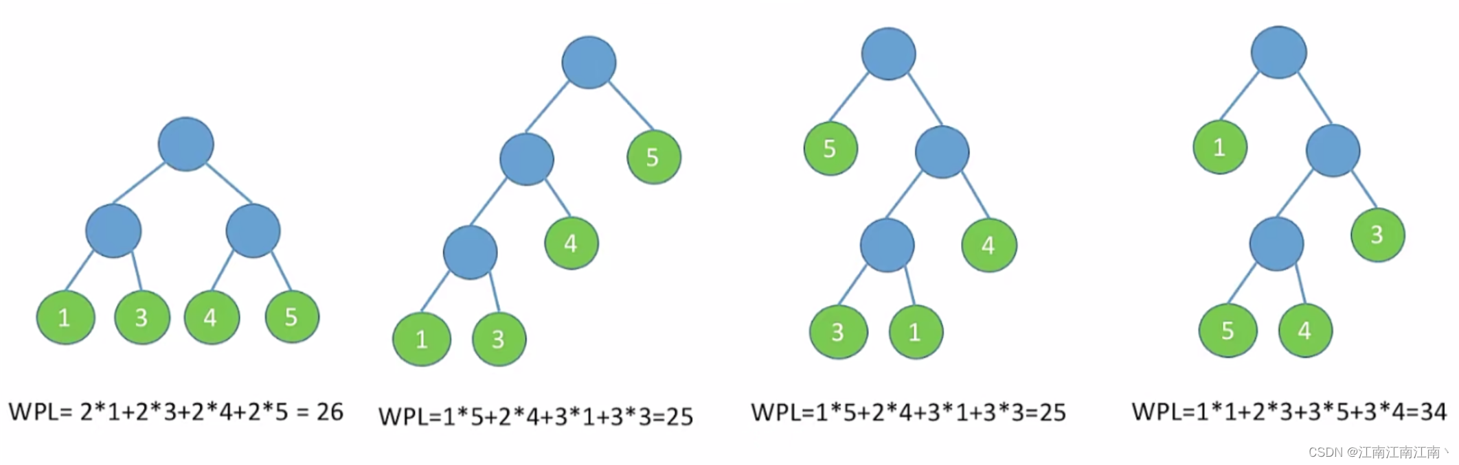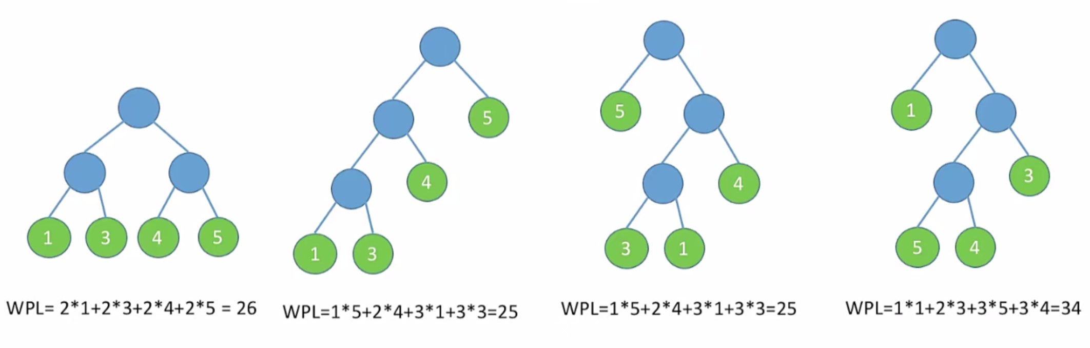 带权路径长度:从树的跟该结点的路径长度(经过的边数)与该点的权值的乘积