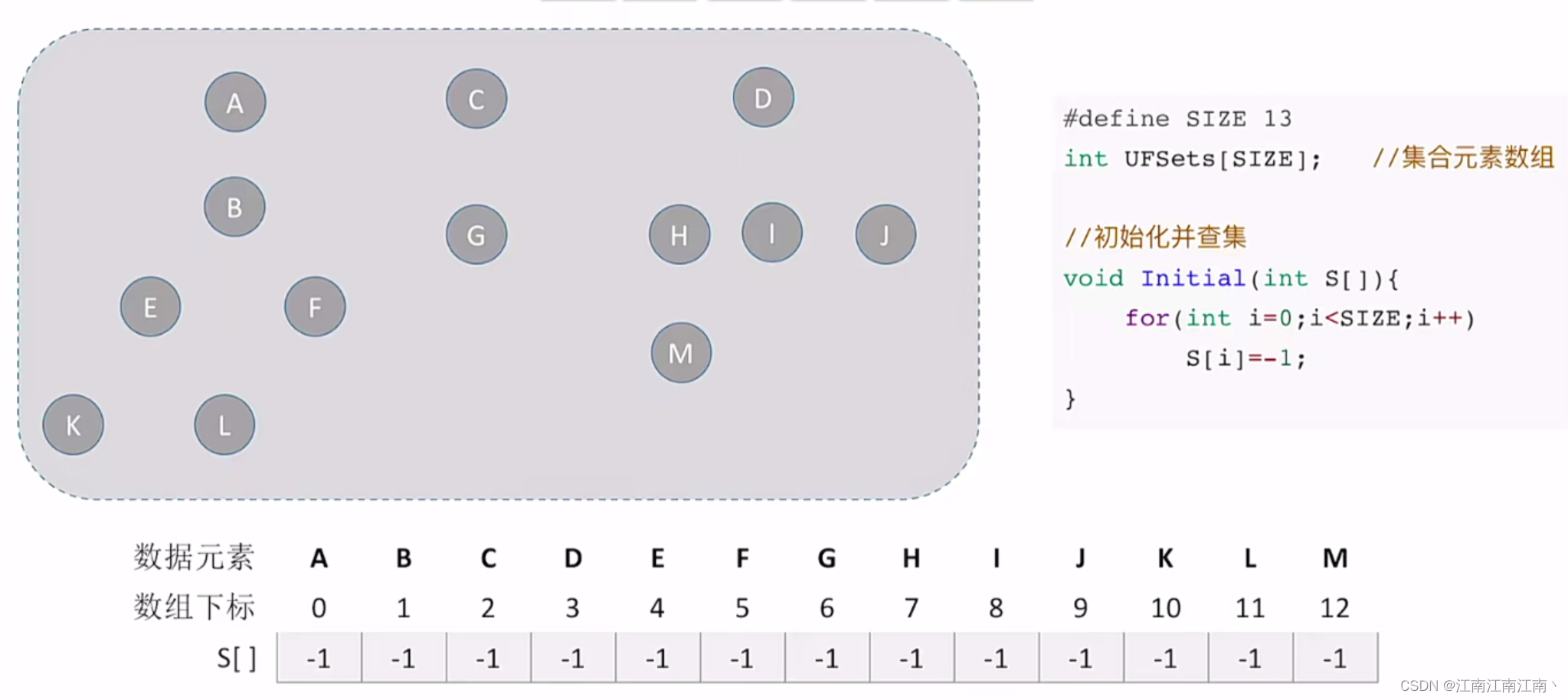 void Initial(int S[]){//-1表示集合中(森林)每个元素都是独立的个体(树)for (int i = 0; i < MAXSIZE; i++) S[i] = -1;