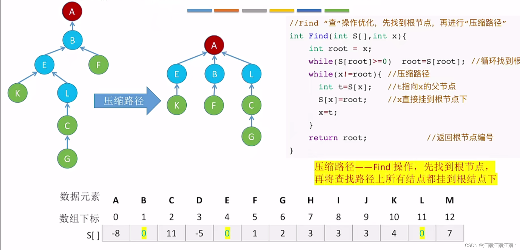 int Find(int S[], int x){int root = x;//向上循环遍历树,找到其根节点while(S[root] >= 0) root = S[root];while (x != root){int temp = S[x];S[x] = root; //将x的双亲结点改为rootx = temp;}return root;