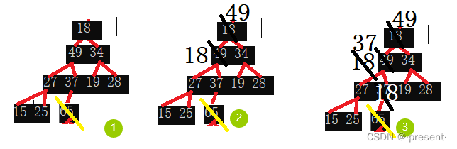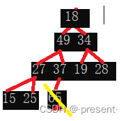 所以我们将堆顶元素(65),和堆最后的一个元素(18)互换.