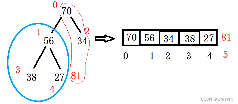 而相应的 56(父亲)的下标1,乘2加1,可以得到它左孩子(38)的下标3